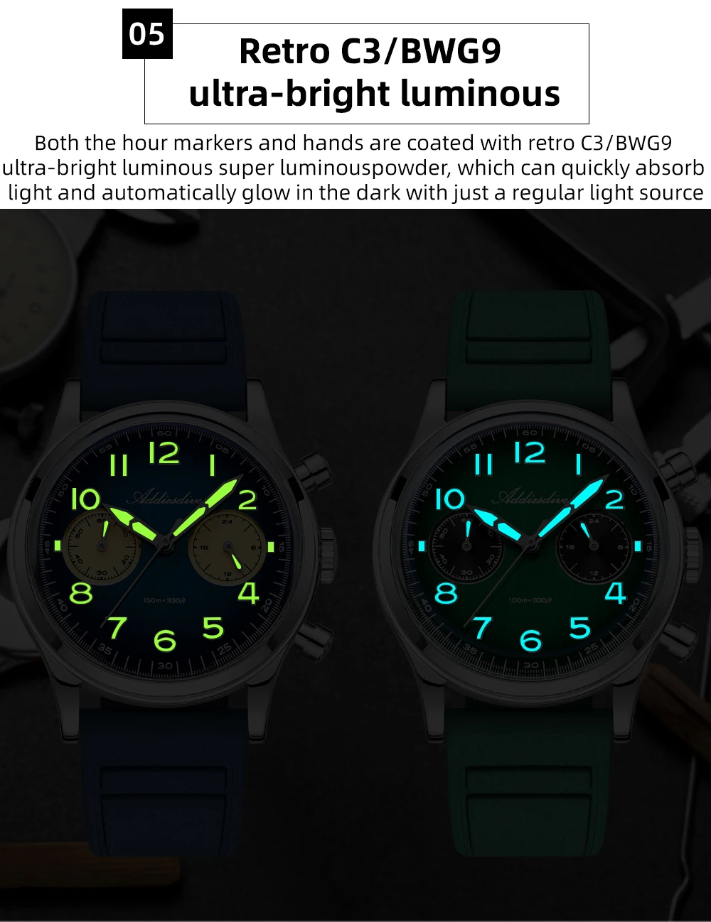 Feature: Luminous, Chronograph, DIVER, Water-Resistance, swim, Luminous Hands
