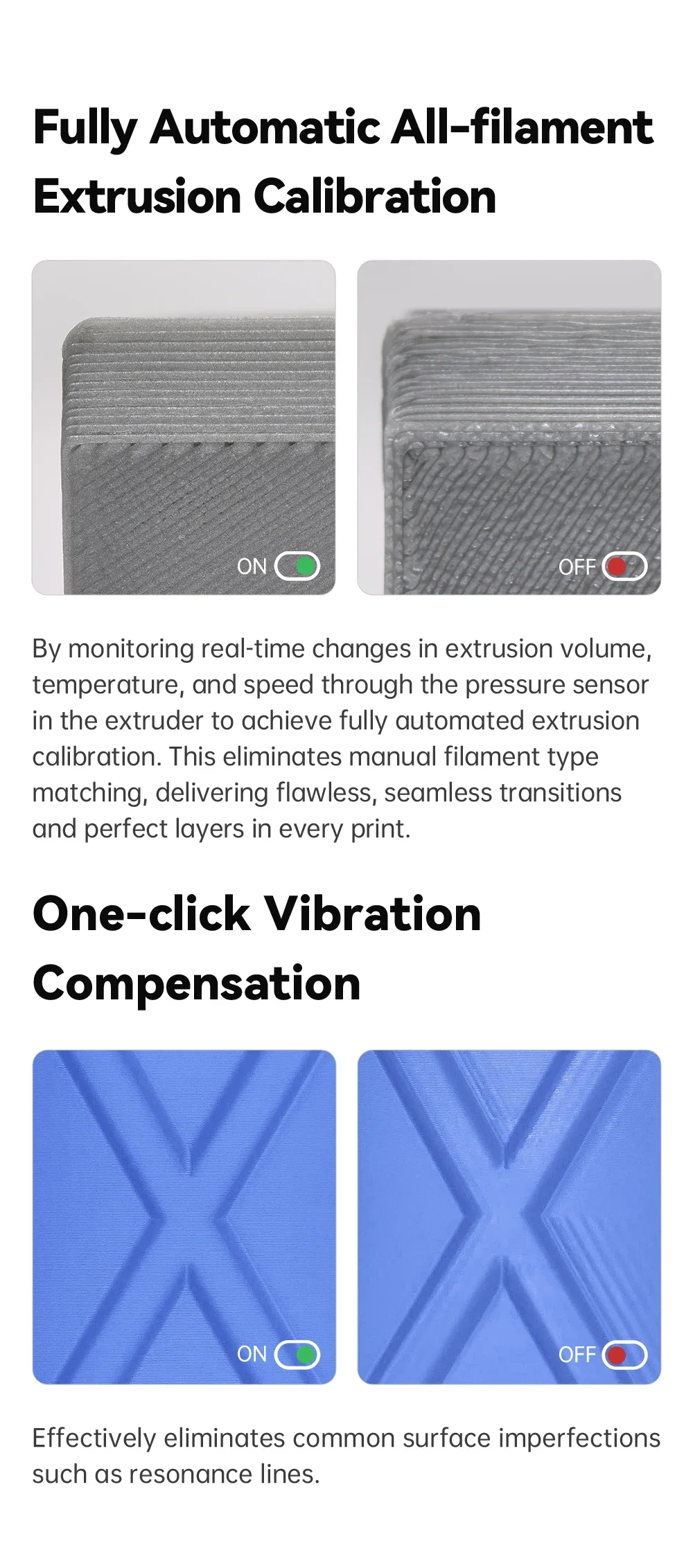 By monitoring real-time changes in extrusion volume temperature, and speed through the pressure sensorin the extruder to achieve fully automated extrusion calibration.This eliminates manual filament type matching, delivering flawless, seamless transitions and perfect layers in every print.