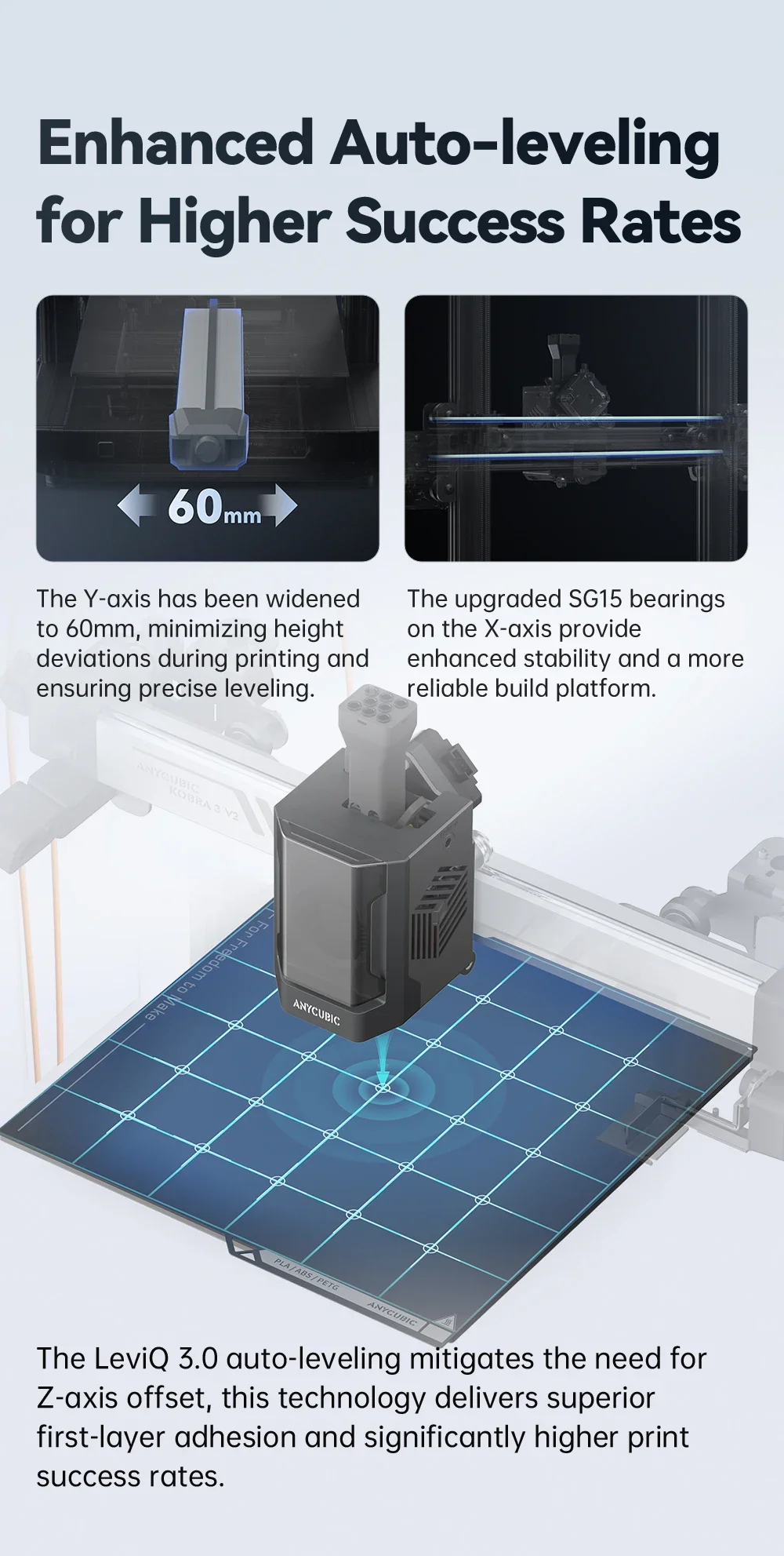 The Y-axis has been widened to 60mm, minimizing height deviations during printing and ensuring precise leveling.
