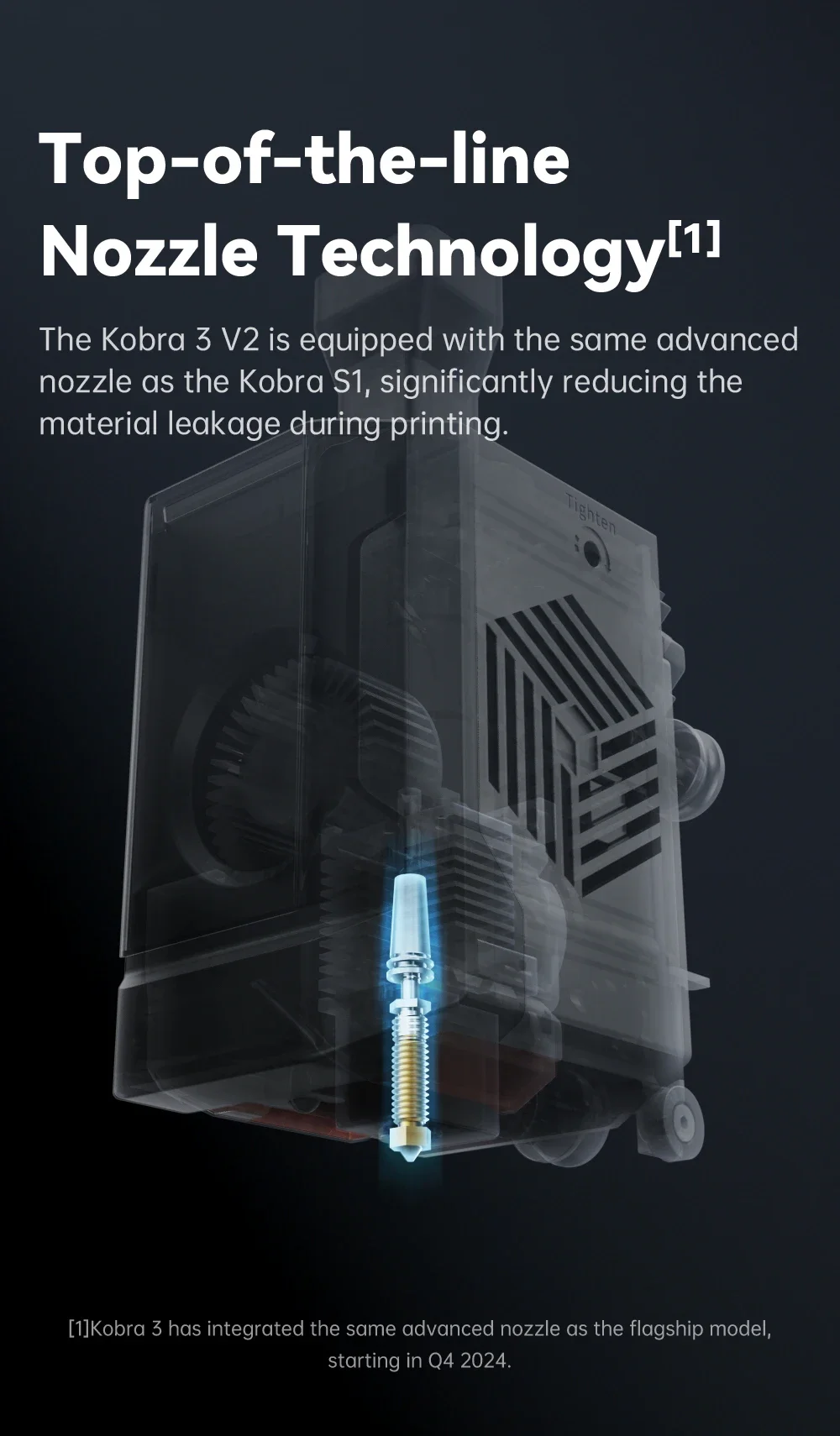 The Kobra 3 V2 is equipped with the same advanced nozzle as the Kobra S1,significantly reducing the material leakage during printing.