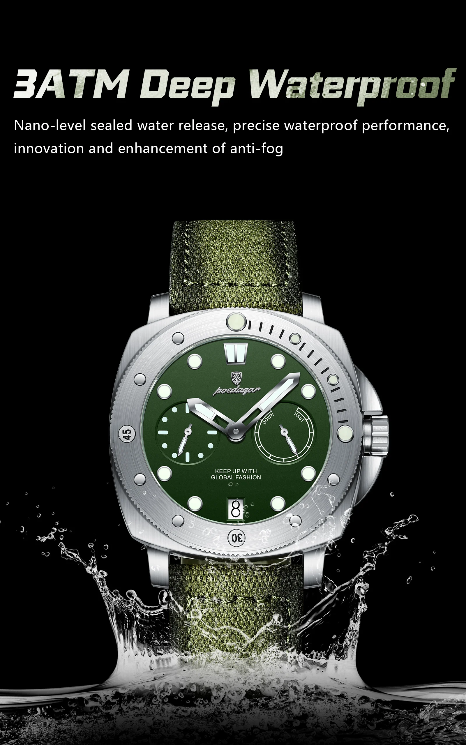 Feature: Luminous, Auto Date, Water-Resistance, swim, Luminous Hands